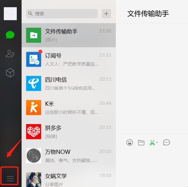 1、首先登录电脑端微信,并点击左下角的三条杠图标。