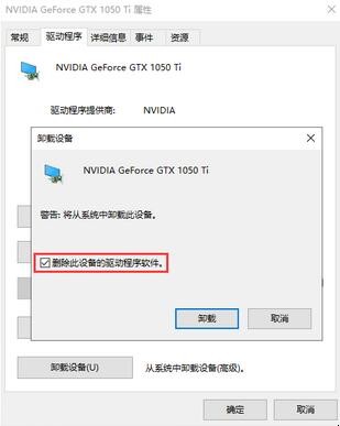 4、在确认窗口中勾选“删除此设备的驱动程序软件”,然后点击“卸载”,这样就能将显卡驱动卸载掉了。