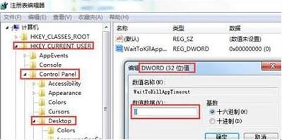 3、在右侧空白处右键鼠标,选择新建-DWORD32位值,名称设置为WaitToKillAppTimeout,数值设置为0,然后点击确定退出即可。