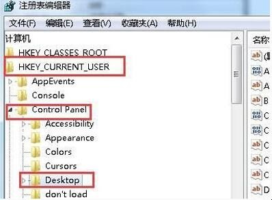 2、在注册表中依次打开HKEY_CURRENT_USERControlPanelDesktop。