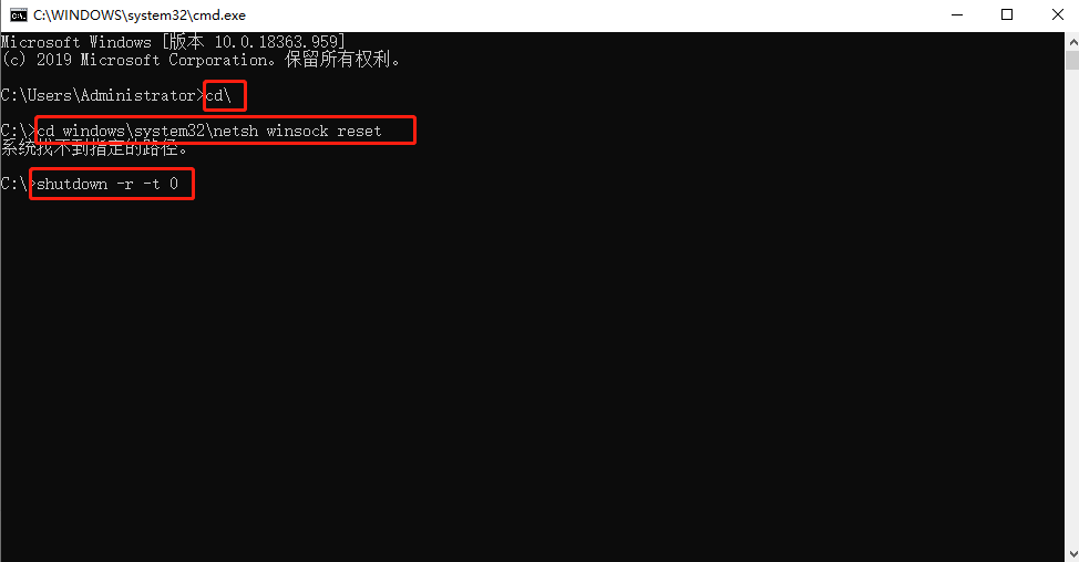 3、输入最后一个命令,回车键执行完毕后,重启电脑即可。