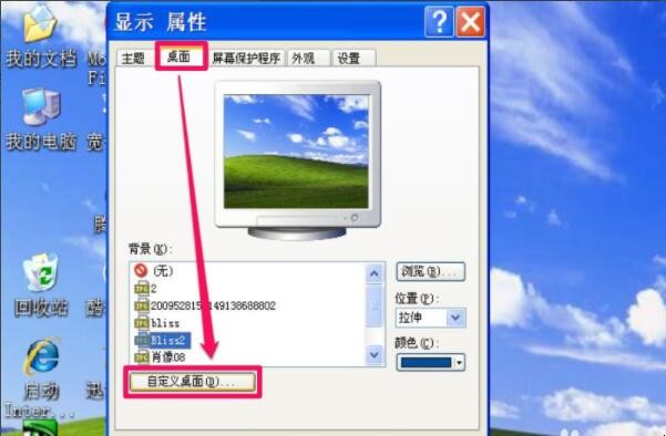 2、打开显示属性窗口后,在选项卡中选择“桌面”这一项,点击界面中的“自定义桌面”,Win7则是选择左侧的“更改桌面图标”。