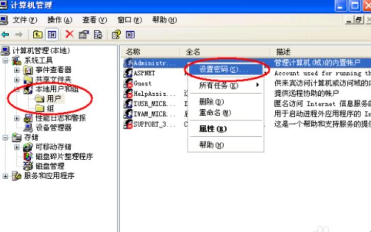 2、在打开的“计算机管理”窗口中,依次点击“本地用户和组”→“用户”,然后右击想要取消密码的用户名,从弹出的菜单中选择“设置密码”项。