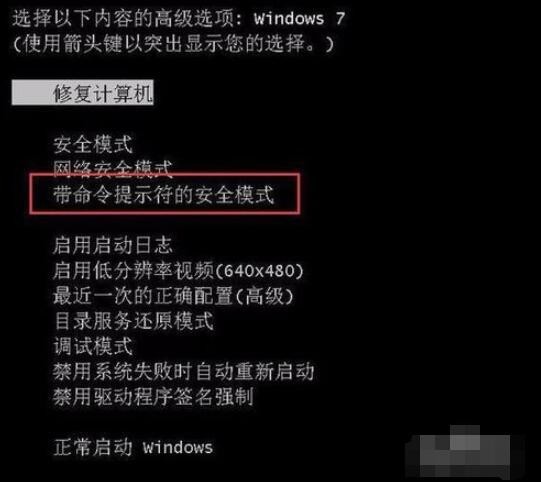 1、重新启动计算机,开机后按下F8键不动直到高级选项画面出现后,再松开手,选择“命令提示符的安全模式”按回车。
