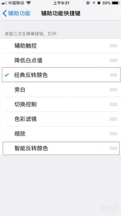 5、最后进入到辅助快捷功能键界面,勾选“经典反转颜色”和“智能反转颜色”即可。