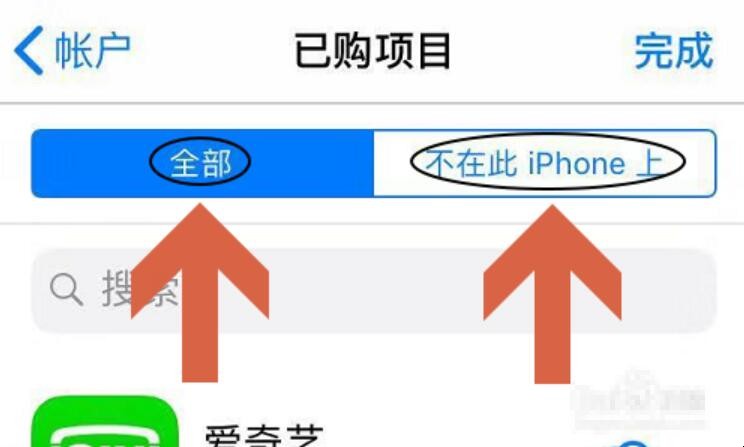 4、很多朋友会以为只有花钱购买过的应用,这里才会显示,其实不然,点击已购项目以后,我们会看到“全部”和“不在此iPhone上”这两项;