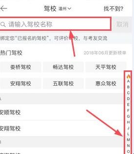 3、我们会在上方看到自己的所在地,可以选择点击更换正确的地方;接下来,我们可以输入驾校的名称,或者直接点击驾考首字进行查询。