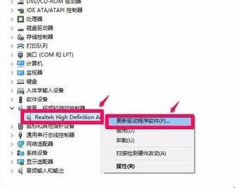 2、找到并点击【展开声音、视频和游戏控制器】,在右键菜单中点击【更新驱动程序软件】。