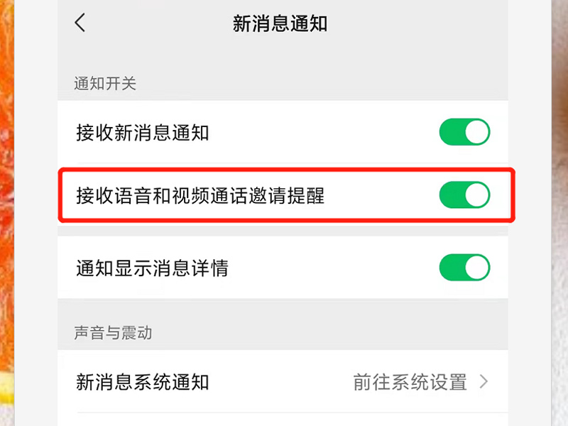 3、进入新消息通知界面后,打开接收语音和视频通话邀请提醒即可。