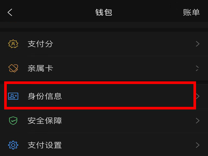 3、进入“钱包”界面后,点击“身份信息”,进入“身份信息”界面。