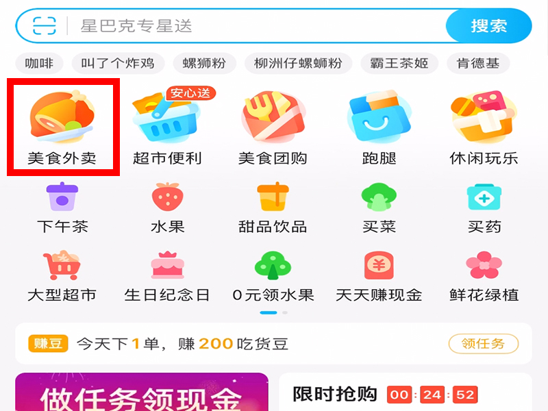 1、打开饿了么,点击“美食外卖”,进入“美食外卖”界面。