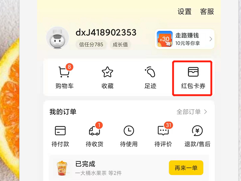 1、打开美团app,点击下方的我的,再选择红包卡卷。