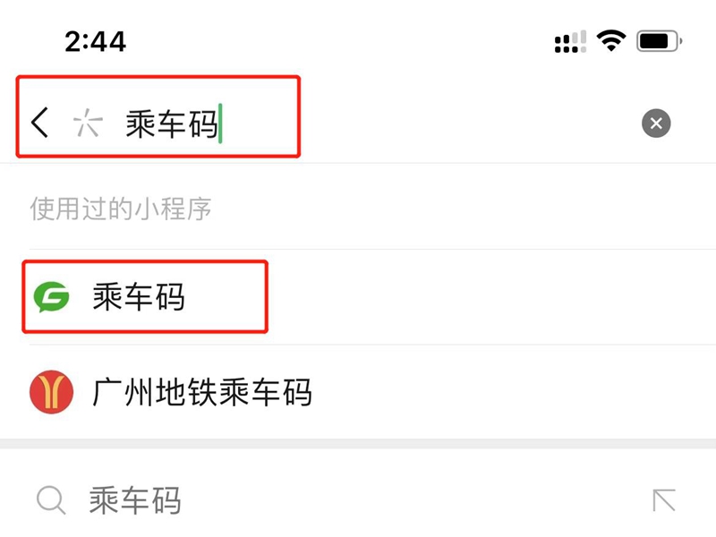 1、打开微信app,在“微信”页面中下拉页面,进入小程序页面,搜索乘车码小程序。