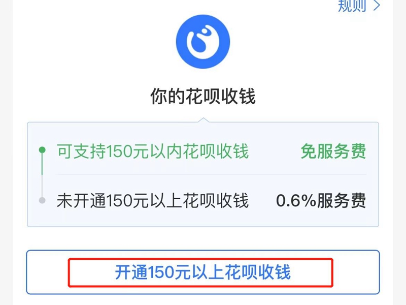 2、点击花呗收钱,选择开通150元以上花呗收钱即可开启。