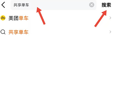 1、打开美团app,在搜索栏中输入“共享单车”,点击搜索。