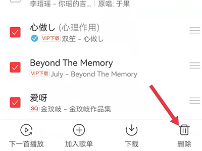 3、勾选需要删除的歌曲,点击“删除”,即可完成批量删除我喜欢里面的歌。