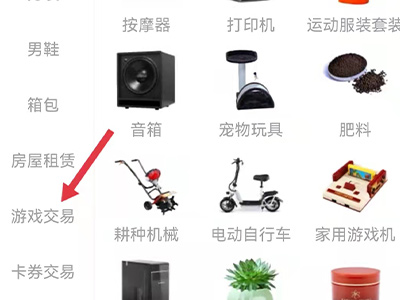 1、打开闲鱼app,在搜索栏的分类页面中找到“游戏交易”,点击进入。