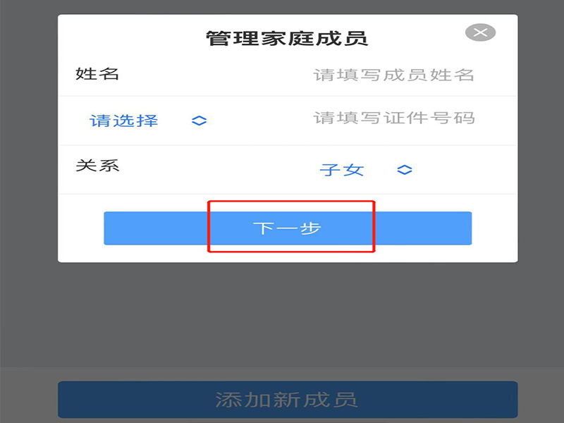 3、在管理家庭成员页面上,点击“添加新成员”,即弹出填写家庭成员信息窗口。
