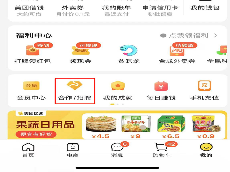 1、打开美团app,在我的个人界面上,点击“合作/招聘”,进入合作/招聘页面。