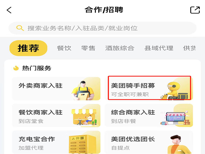 2、在合作/招聘页面上,点击“美团骑手招募”,进入美团骑手招募页面。
