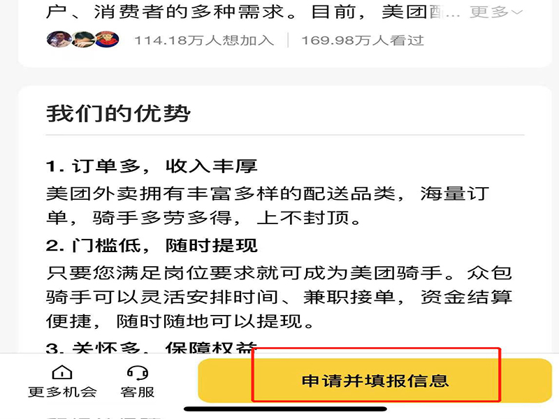 3、在美团骑手招募页面上,点击“申请并填报信息”,进入申请并填报信息页面。