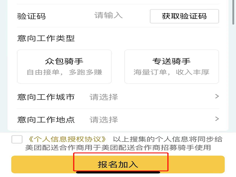 4、在申请并填报信息页面上,填写好报名信息,之后选择工作类型,并点击“报名加入”即可。