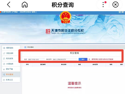 天津市积分落户人员可以登录“天津网上办事大厅-居住证积分专栏”查询积分,输入身份证号即可查询落户结果。查询天津市积分落户人员名单即其积分的操作方法如下: