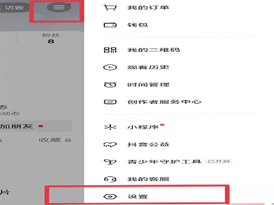 2、点击右上角的三横图标,点击“设置”图标,进入设置页面。